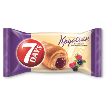 Круассан 7Days ягодное ассорти 65г с джемом из натуральных ягод собственного производства. Насладитесь сочным вкусом ароматных ягод. Круассан 7 Days -это питательная порция выпечки, наполненная кремов...