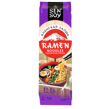 Крупная, толстая и плоская лапша RAMEN от Sen Soy очень вкусна в супе мисо, а также в поджаренном виде и в качестве гарнира к сашими.