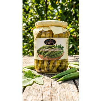 Баночка маринованной бамии выглядит очень привлекательно. Зелёные, стручкообразные плоды, разного размера, уложены очень аккуратно и залиты маринадом. Внутри плодов - семечки. Но семечки мягкие и съед...