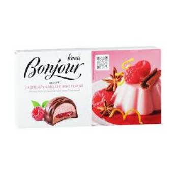 Десерт KONTI Бонжур Кокос – оригинальный десерт, состоящий из сахарного печенья, ароматной желейной начинки со вкусом кокоса, воздушного суфле и покрытый глазурью.